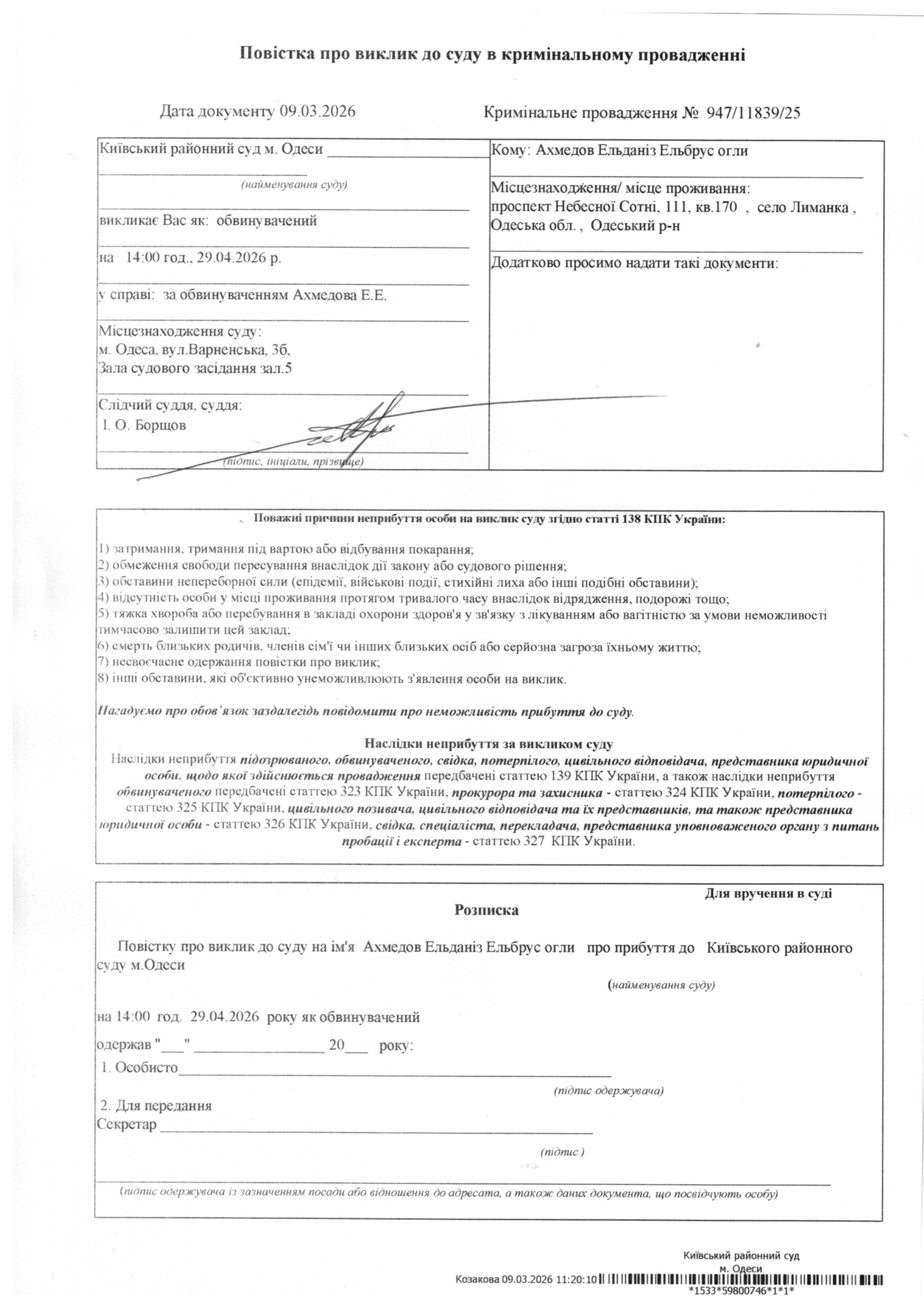 Cудова повістка про виклик до суду Ахмедов Е.Е.