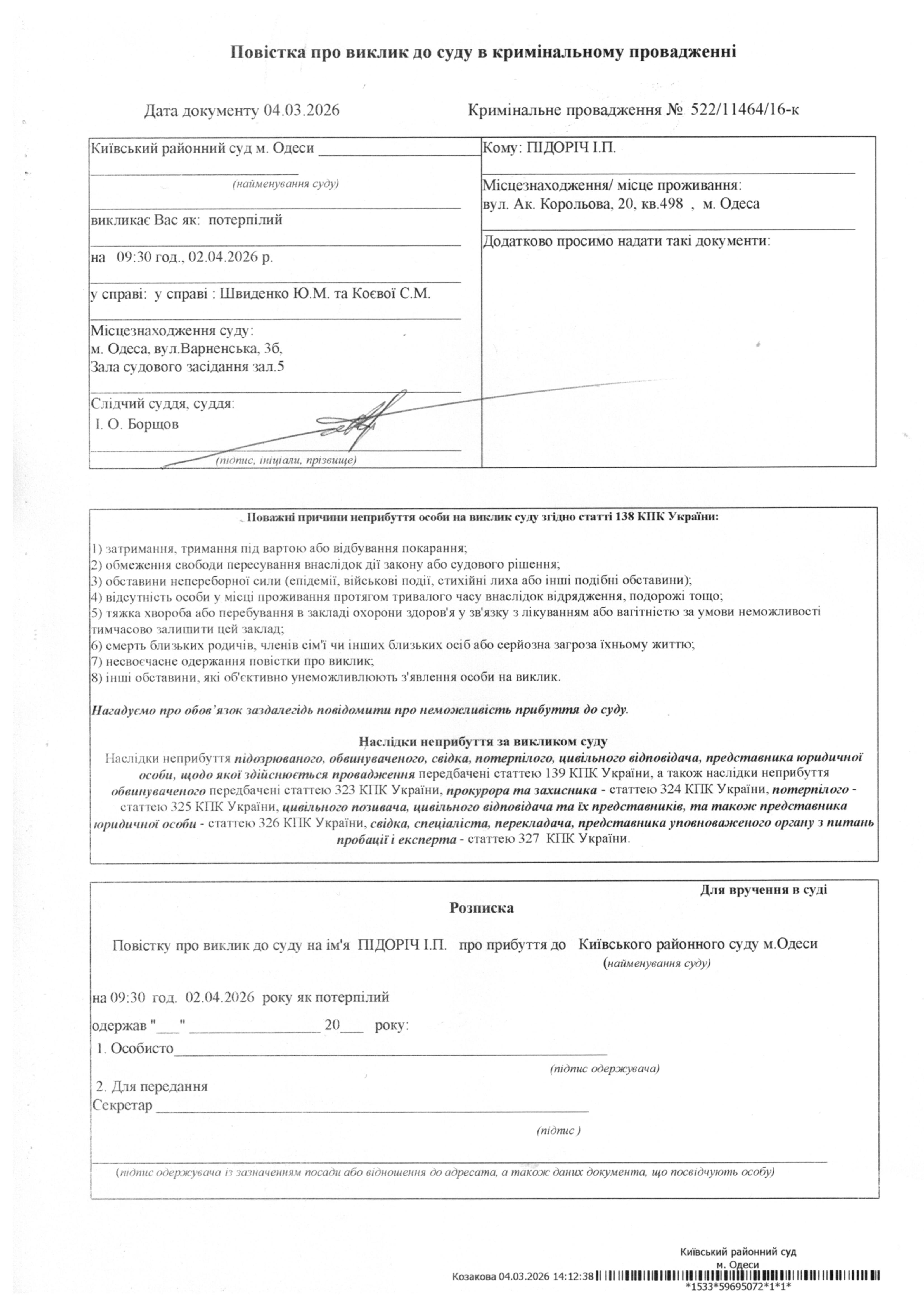 Повістка про виклик до суду Підоріч І.П.