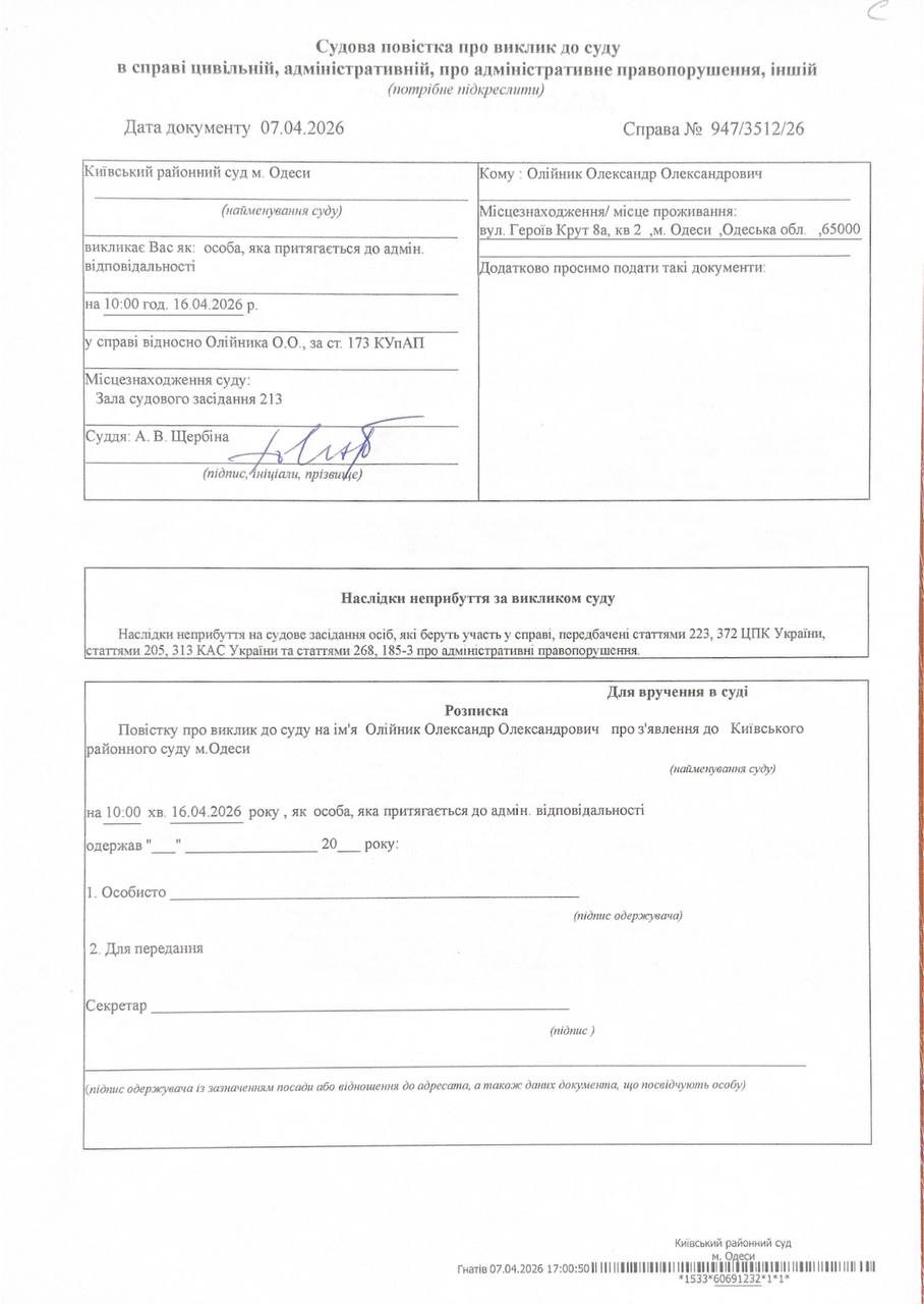 Повістка про виклик до суду Олійник О О