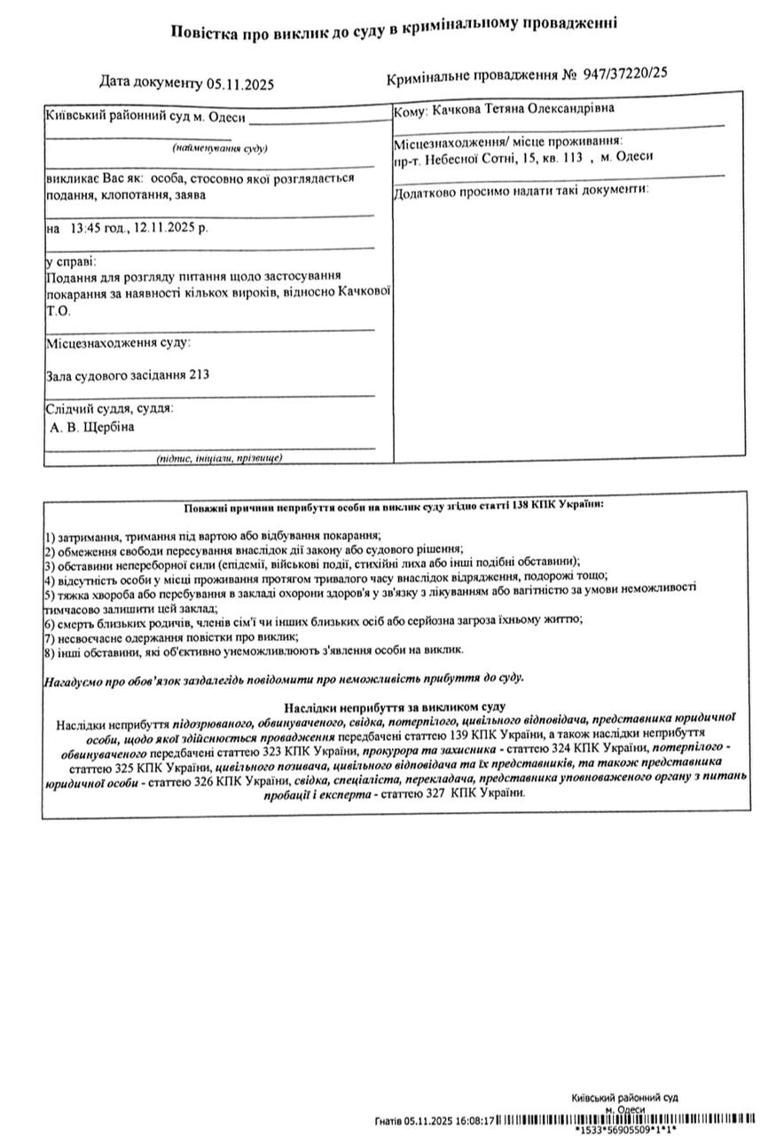 Повістка про виклик до суду Качкова Т.О.