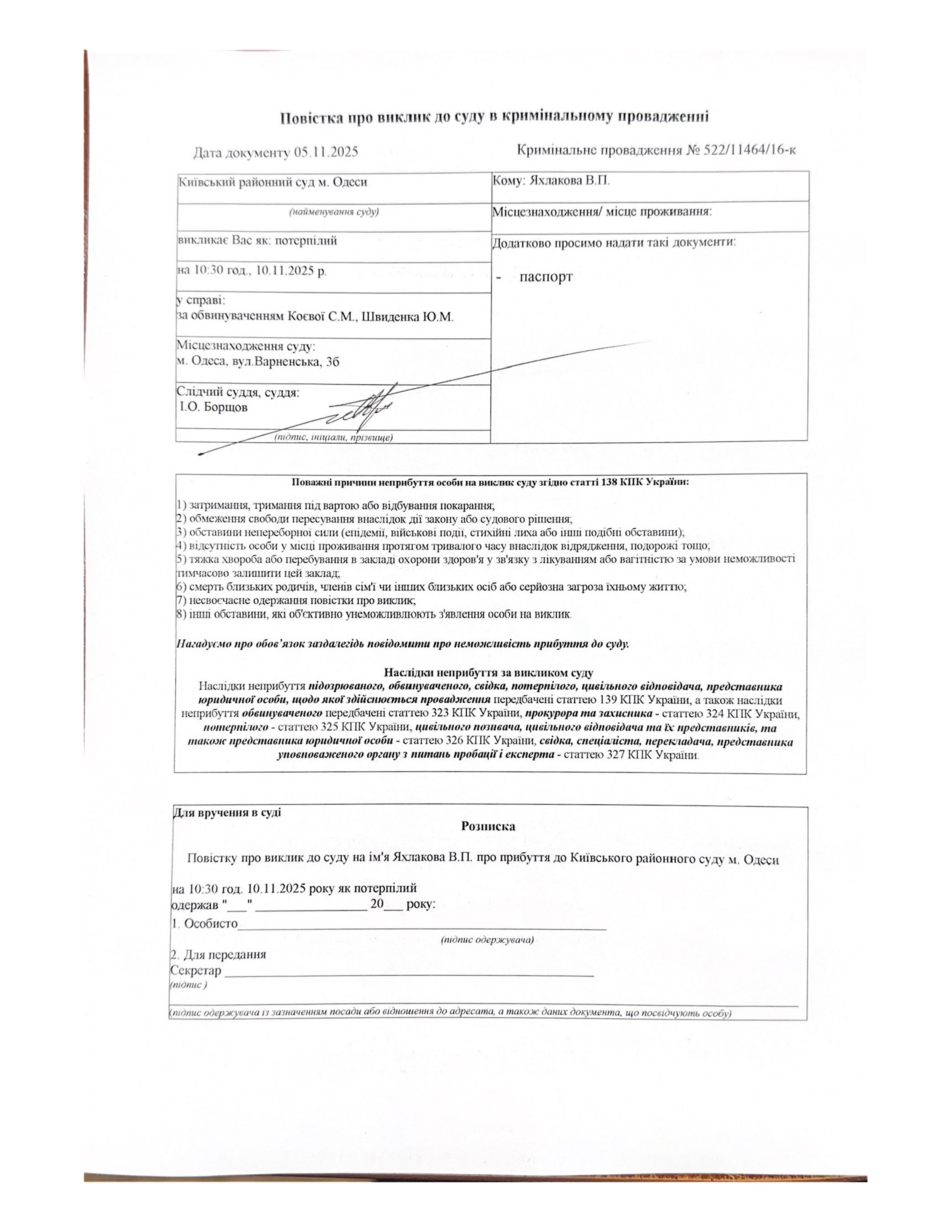 Повістка про виклик до суду в кримінальному провадженні Яхалкова В.П.
