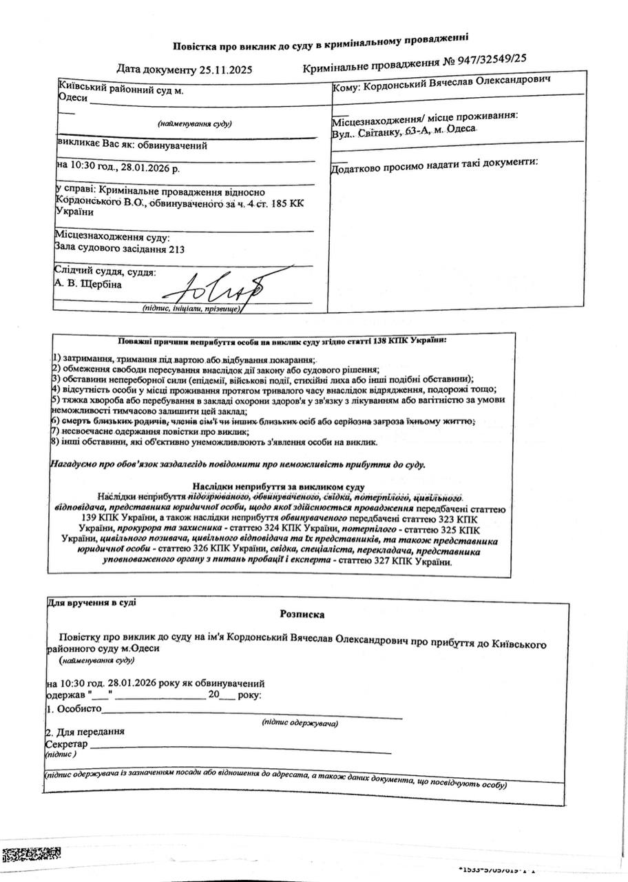 Повістка про виклик до суду Кордонський В.О.