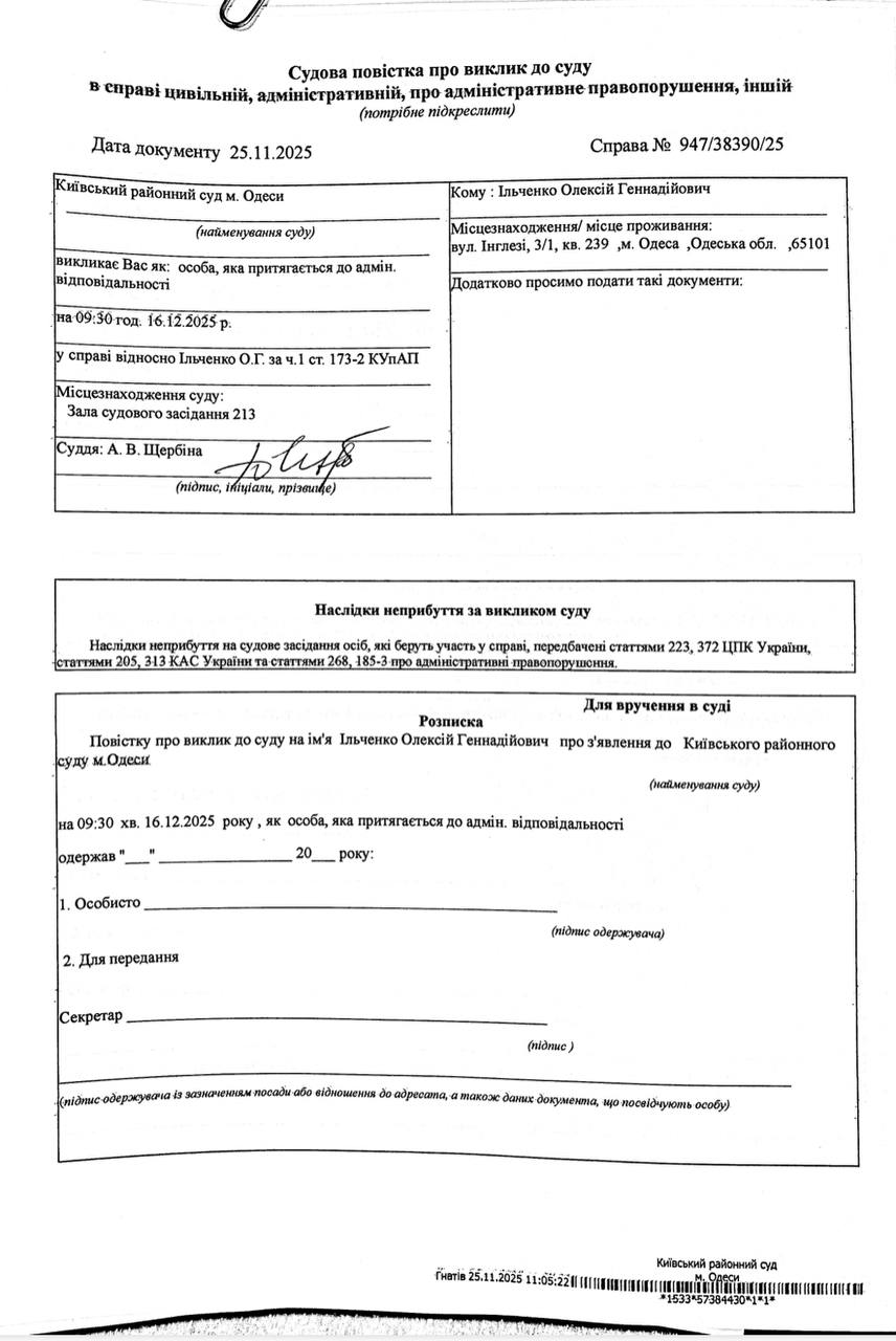 Повістка про виклик до суду Ільченко о.Г.