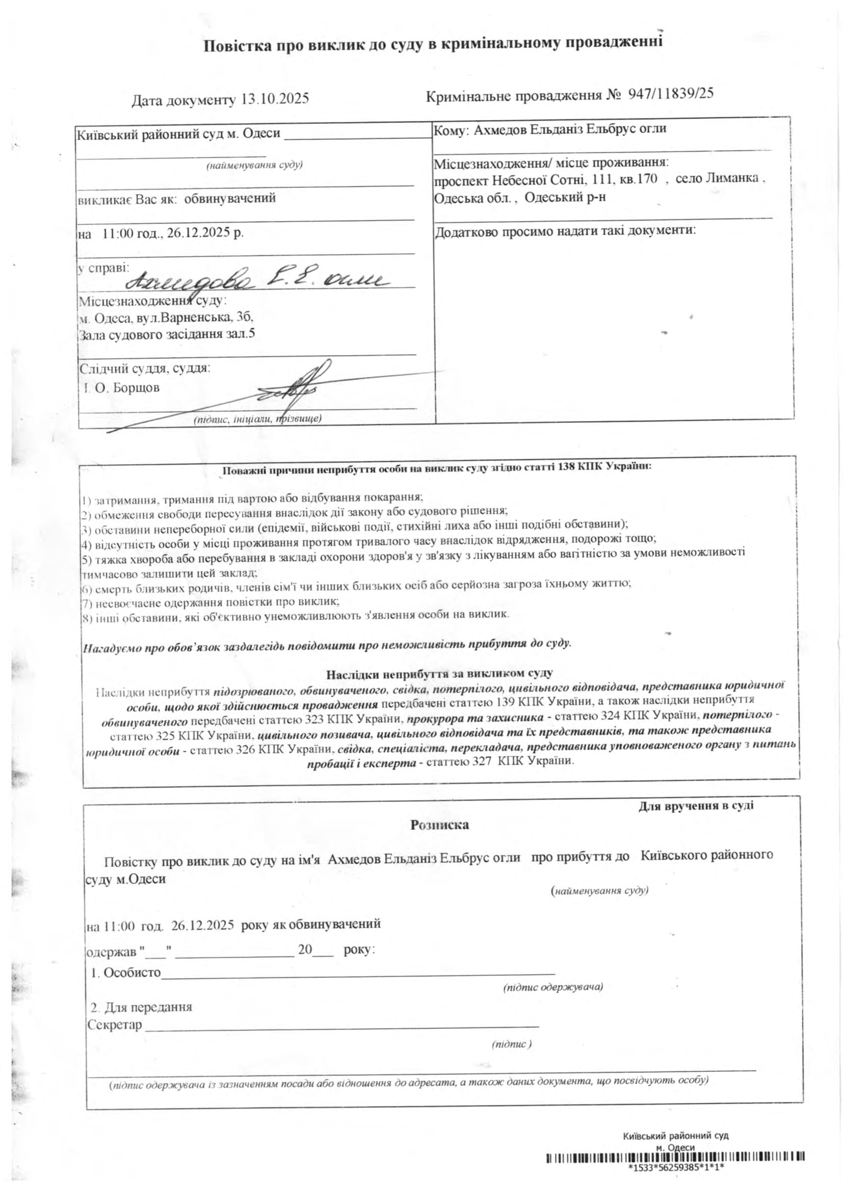 Повістка про виклик в судове засідання Ахмедов Ельданіз Ельбрус