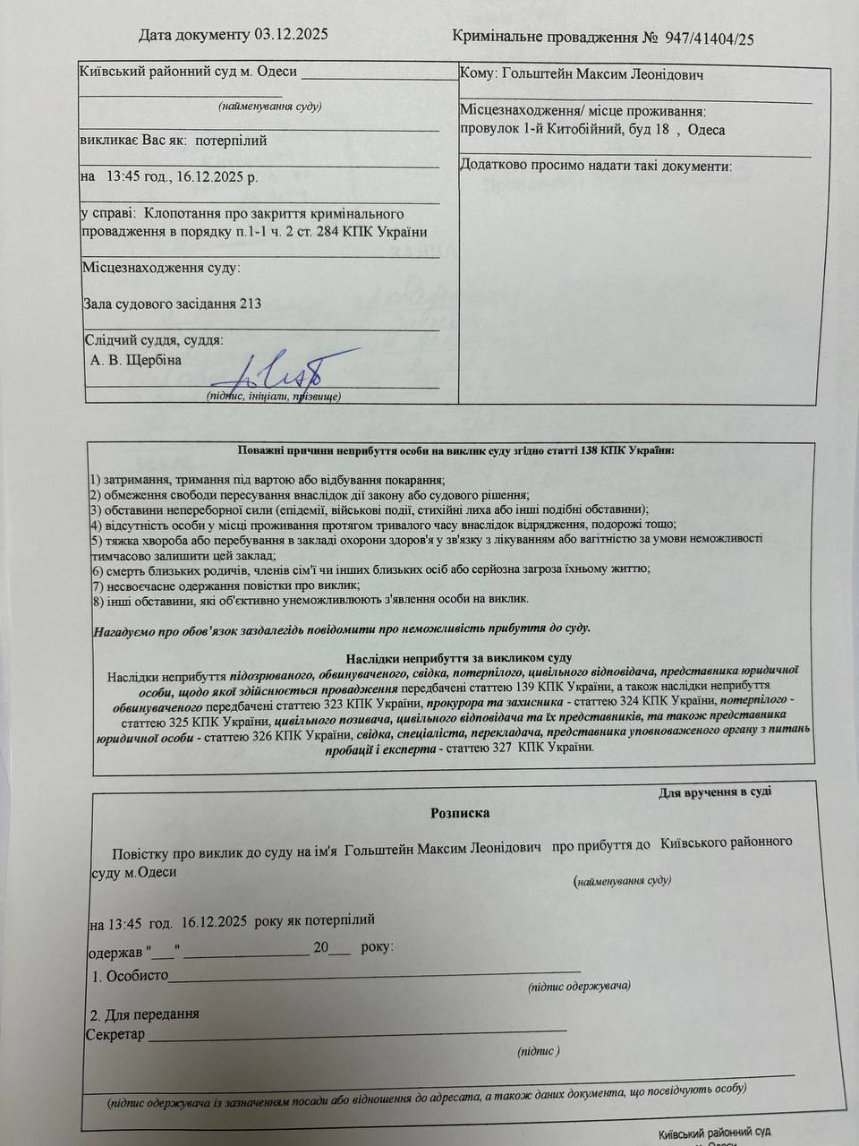 Повідомлення про виклик у судове засідання Гольштейн М.Л.