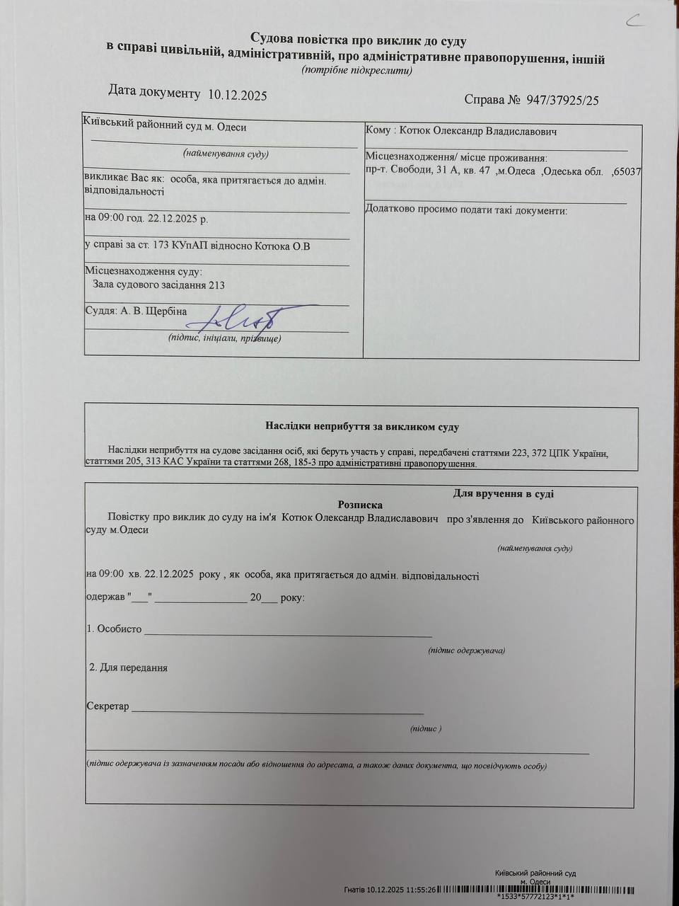 Повістка про виклик до суду Котюк О В