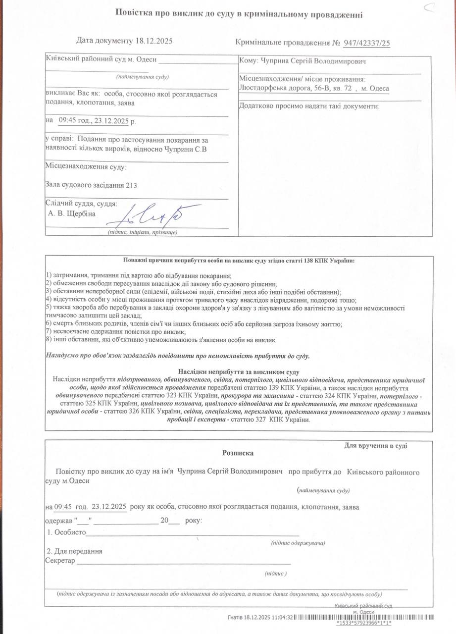 Повістка про виклик до суду Чуприна С В