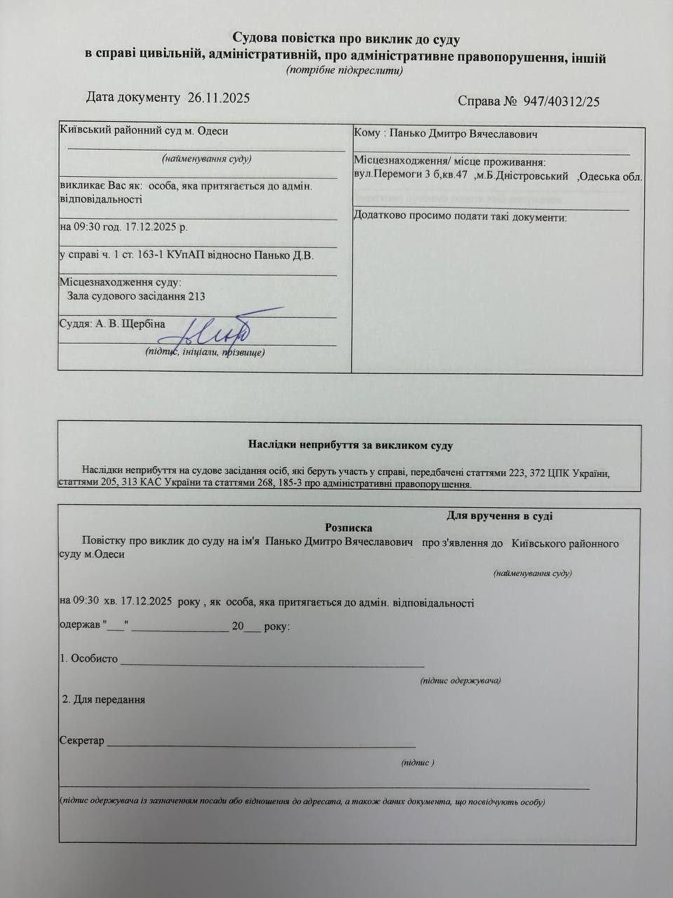 Повістка про виклик до суду Панько Д.В.