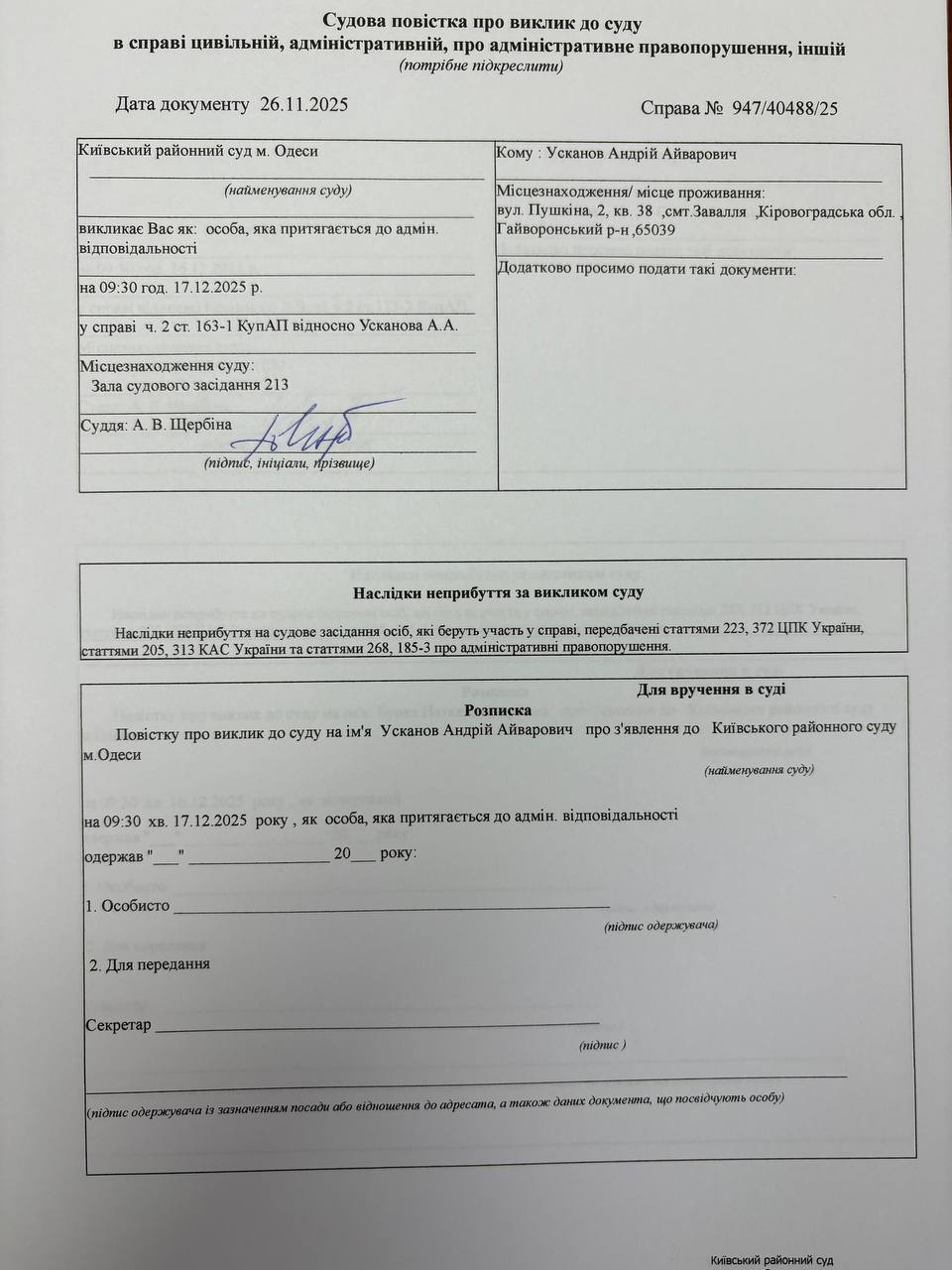 Повістка про виклик до суду Усканов А.А.