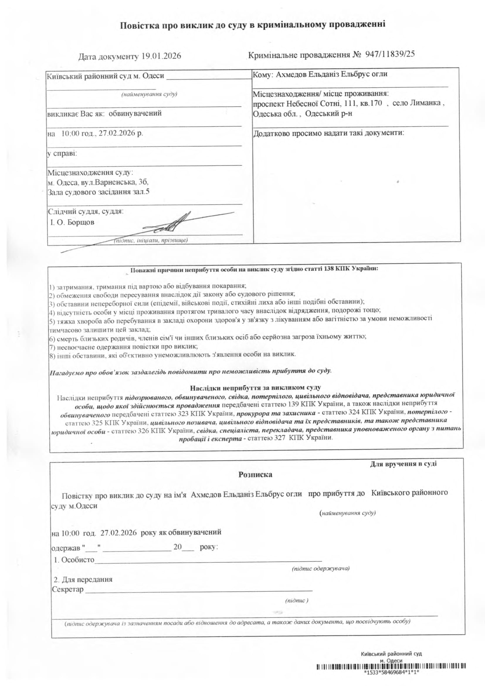 Повідомлення про виклик у судове засідання Ахмедов Е.Е.