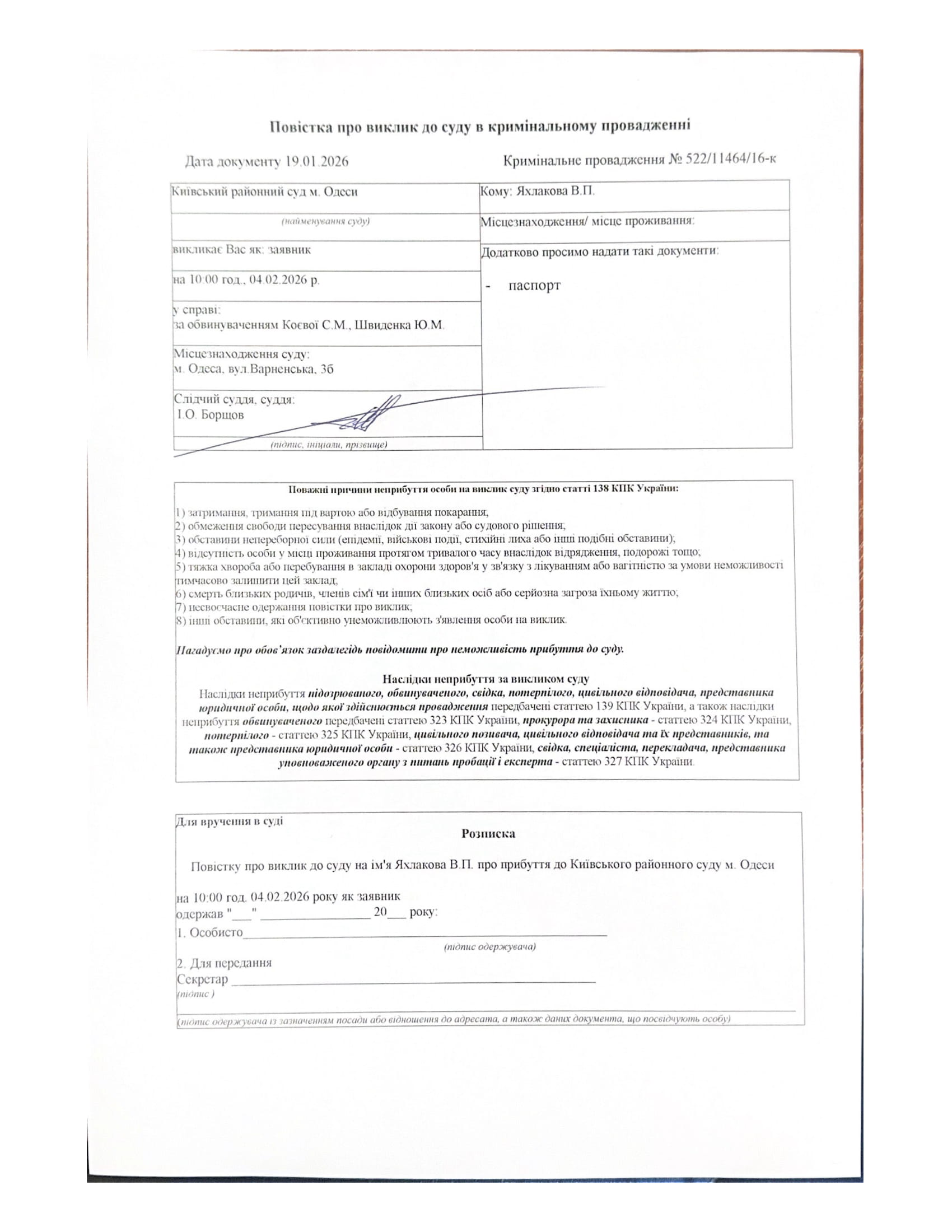 Повідомлення про виклик у судове засідання Яхлаков В.П.