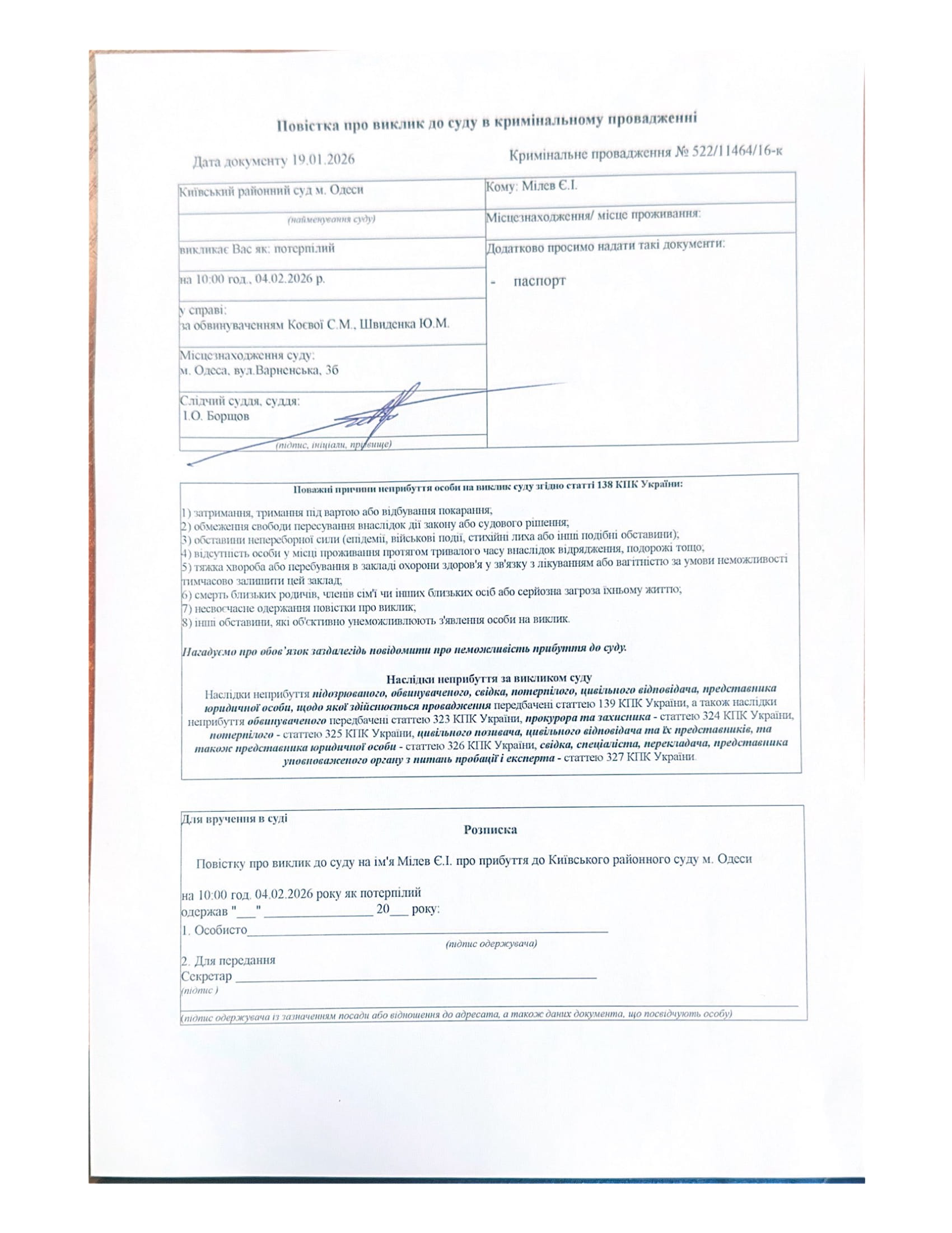 Повідомлення про виклик у судове засідання Мілєв Є.І.