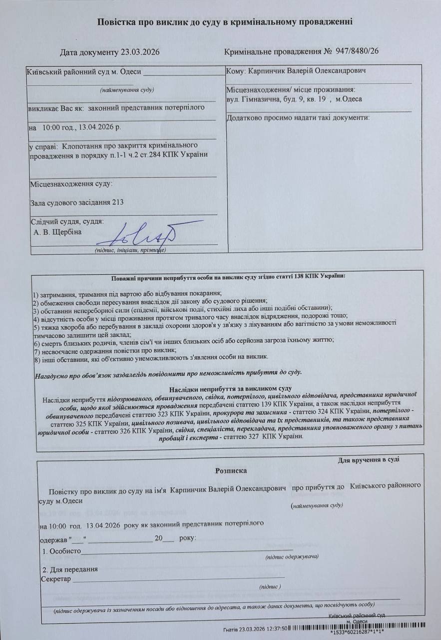 Оголошення про виклик особи в суд та повідомлення про судове рішення