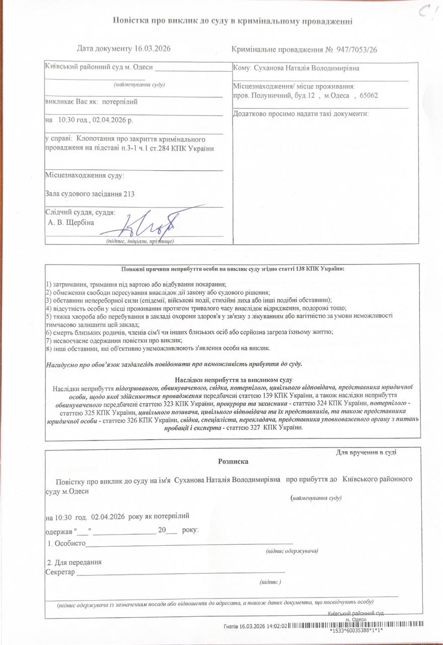 Повістка про виклик до суду Суханову Н В