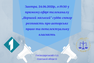 Пресслужба суду повідомляє, що завтра, 24 червня 2021 року, о 19:30 у прямому ефірі Одеського телеканалу „Перший міський” суддя-спікер Господарського суду Одеської області Юлія Щавинська візьме участь у проєкті „Хліба і Видовищ” на тему: „Авторське право та інтелектуальна власність”.